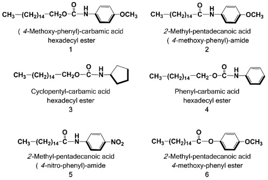 The aim of this work is the biological evaluation of a small library of PEA analogues or derivatives, 1–6, characterized by a protected acid function, prepared by some of us [27,28], which could bring a decreased hydrolysis rate in a living system (Figure 2). Compound 4, together with 2-methyl-pentadecanoic acid (4-nitro-phenyl)-amide (5), has demonstrated an interesting antioxidant and anti-inflammatory activity. Finally, crystals of phenyl-carbamic acid hexadecyl ester (4)—suitable for X-ray analysis—have been obtained, and the solved crystal structure is reported.
