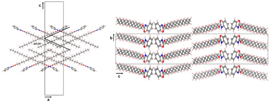 Packing views of the crystal structure of compound 4 down a (left) and down b (right) axes [29].