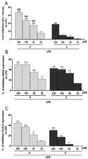 To further confirm the observed effect of 4 compared to 5 during LPS-induced inflammation, we evaluate iNOS and COX-2 expression in LPS-treated macrophages. In J774A.1 macrophages, 4 significantly inhibited iNOS at all the tested concentrations (p < 0.05 vs. LPS; Figure 4B) and COX-2 expression in a range concentration of 200–50 µM (p < 0.05 vs. LPS; Figure 4C). In addition, 5 significantly inhibited iNOS in a µM concentration range (p < 0.001 vs. LPS; Figure 4B) and COX-2 expression in a µM concentration range (p < 0.001 vs. LPS; Figure 4C).