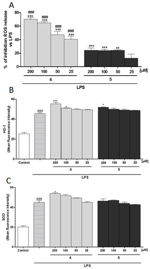 (A) Effect of 4 and 5 (200–25 µM) on LPS-induced reactive oxygen species (ROS) in LPS-stimulated J774A.1 macrophages. Effect of 4 and 5 (200–25 µM) on (B) LPS-induced HO-1 and on (C) LPS-induced Superoxide dismutase SOD expression in macrophages J774A.1. Values, mean ± S.E.M. are expressed as % of inhibition vs. J774A.1 treated with LPS alone and as mean fluorescence intensity of at least three independent experiments with three replicates each. Comparisons were performed using one-way analysis of variance, and multiple comparisons were made by Bonferroni’s test. ***, **, and * denote p < 0.001, p < 0.01, and p < 0.05 vs. LPS, respectively. ### denotes p < 0.001 vs. 5.