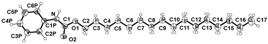 The carbon atoms of the alkyl chain are arranged in a classical zig-zag fashion, with all C–C units staggered and in anti-conformation. The mean plan fitted through the atoms chain have an rms deviation of 0.0419 Å and form an angle of 14.5° with the plane fitted through the amide group, which is in turn tilted 21.8° from the phenyl ring.