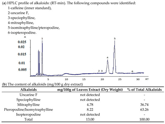 Determination of alkaloids in decoction of Uncaria tomentosa leaves was carried out according to Pilarski et al. [9]. To 100 mg of the dry powder (lyophilized decoction) 2% sulfuric acid solution (15 mL) was added and the mixture was sonicated for 15 min in an ultrasonic bath (Sonorex RK 103H, Bandelin, Berlin, Germany). The mixture was then centrifuged at 3000 rpm for 10 min and extracted tree times with 10 mL of ethyl acetate. The aqueous phase was separated and adjusted to pH 10 with 10% ammonium hydroxide, then extracted three times with 10 mL of ethyl acetate each. The organic extracts were combined, evaporated to dryness and the residue was dissolved in 10 mL of methanol. The qualitative and quantitative analysis of alkaloids was performed by HPLC using a LiChrospher 100 RP-18 (250 mm × 4 mm, Merck, Darmstadt, Germany) column and a LiChrospher 100 RP-18 (4 mm × 4 mm, Merck) precolumn; solvents: A—phosphate buffer solution (10 mM, pH 6.6), B—methanol:acetonitrile (1:1); gradient from (60% A and 40% B) to (30% A and 70% B); time: 30 min, flow rate 1 mL/min; detection at 245 nm with L-7450 Diode Array Detector (Merck-Hitachi, Darmstadt, Germany). The calibration curves were obtained from standard solutions of the alkaloids (isopteropodine, pteropodine, isomitraphylline, uncarine F, mitrophylline, speciophylline) in concentrations between 0.01 and 1.0 mg/mL. The standards of oxindole alkaloids were purchased from ChromaDex (Santa Ana, CA, USA). All standards came with NMR, MS and HPLC data. As an internal standard caffeine was used. Linear relationships between peak area and alkaloid concentration was observed. The results of the quantitative determination of alkaloids in the extract were presented in mg/100 g of extract dry weight.