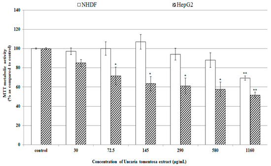 Cell viability assessed by MTT mitochondrial conversion. NHDF and HepG2 cells were treated with Uncaria tomentosa leaves extract (30–1160 µg/mL) for 72 h at 37 °C. Then, the mitochondrial metabolic activity of cells was measured by MTT assay. Data are expressed as means ± SD from three independent experiments performed in triplicate. Statistically significant differences: * p < 0.05 and ** p < 0.001 refer to the control (untreated cells).