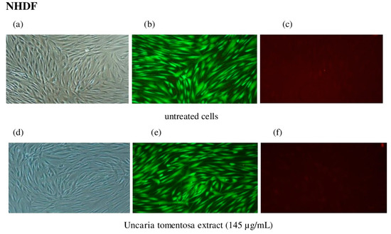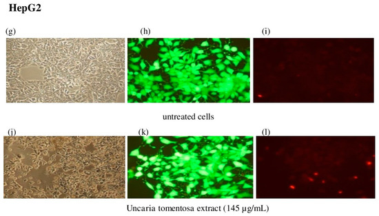Morphologic changes of NHDF (a–f) and HepG2 (g–l) cells after treatment with Uncaria tomentosa extract. Untreated cells (a,g) observed in the light microscope (100×); (b,h) in fluorescence (200×) after calcein-AM staining, (c,i) in fluorescence (200×) after PI staining. Cells treated with 145 µg/mL of the extract observed in fluorescence after calcein-AM (e,k) and PI staining (f,l), respectively. The calcein in viable cells emits green fluorescence, while PI emits red fluorescence only in dead cells.