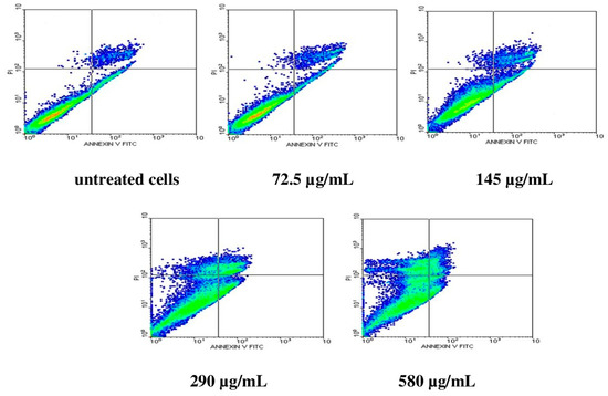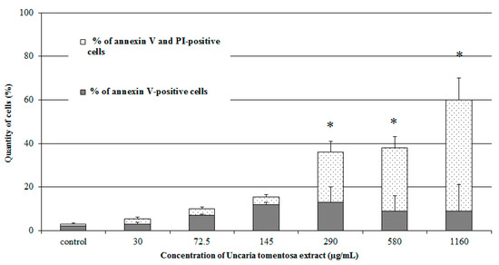 Incubation of HepG2 cells with the Uncaria tomentosa leaves decoction at the concentrations of 72.5 µg/mL and −145 µg/mL resulted in an increase in the number of Annexin positive cells corresponding to apoptotic cells, while not significant differences in the number of Annexin positive and PI positive cells were observed. Uncaria tomentosa decoction concentrations higher than 145 µg/mL caused a significant increase (* p < 0.05) in the number of late apoptotic (Annexin positive and PI positive) or also necrotic cells (Figure 4).