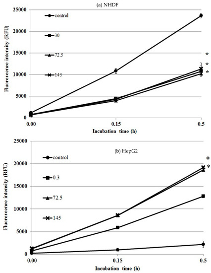 ROS formation in (a) NHDF and (b) HepG2 cells treated with Uncaria tomentosa leaves extract. Cells were exposed to extract (30–145 µg/mL) for 1 h at 37 °C and then were treated with 250 µM DCFH-DA. Control represents untreated cells. Results are presented as means of three independent experiments performed in triplicate. Level of significance was * p < 0.05 as compared to the control (untreated cells).