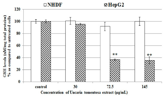 Influence of our Uncaria tomentosa leaves extract on GSH levels in HepG2 and NHDF cells. Cells were treated with tested extract (30–145 µg/mL) for 4 h at 37 °C and intracellular concentration of GSH were measured as described in the Materials and Methods section. Data are expressed as means ± SD from two independent experiments performed in triplicate. Statistically significant difference ** p < 0.001 refers to the control (untreated cells).
