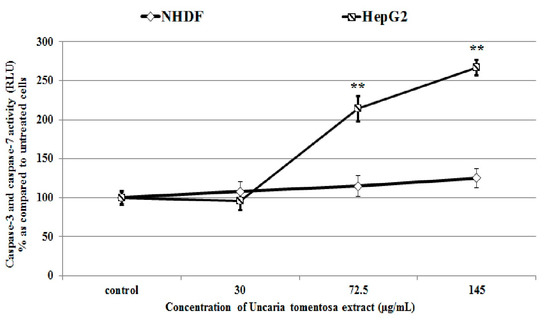 Modulation of the redox processes by tested extract may play a pivotal role in the loss of cell viability. ROS overproduction and decreased GSH levels may lead to destruction of intracellular structures and the cells may enter the pathway of death as indicated by observed changes in cell morphology and in the number of Annexin positive cells. Apoptotic effect of Uncaria tomentosa in HepG2 cells was confirmed by the activation of effector caspase-3 and caspase-7. In HepG2 cells the tested extract at the concentrations ≤145 µg/mL increased effector caspase-3 and caspase-7 activity by 250% (** p < 0.001, Figure 7) as compared to the basal activity (untreated cells). In NHDF cells the effect of the extract on these caspases was not significant as compared to untreated cells-control (Figure 7). These results are in agreement with the recent findings that Uncaria tomentosa induced cancer cell death through caspase-3 dependent apoptosis [14].