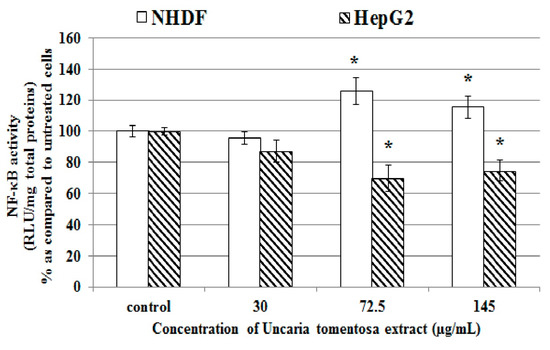 Oxidation-reduction potential of a cell has a direct impact on NF-κB regulation, which is involved in various processes, including cell proliferation and death [24]. Inconsistent data on effects of the individual components of Uncaria tomentosa as well as different extracts on modulation of the activity of NF-κB were reported [12,24]. The present study showed that incubation of HepG2 cells with the water Uncaria tomentosa extract resulted in about 25%–30% reduction (* p < 0.05) of NF-κB activity (Figure 8), while in NHDF cells incubated with this extract about 16%–26% increase (* p < 0.05) in NF-κB activity was noted.