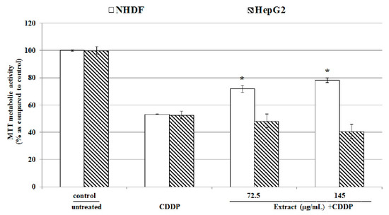 MTT assay (cell viability) results in NHDF and HepG2 treated 72 h at 37 °C with selected concentration of Uncaria tomentosa leaves extract (72.5–145 μg/mL) and the last 48 h also with CDDP (IC50 of 11.25 μM CDDP for HepG2 determined in our laboratory was used). Data are expressed as means ± SD from three independent experiments performed in triplicate. Statistically significant differences: * p < 0.05 refer to the CDDP alone treated cells.