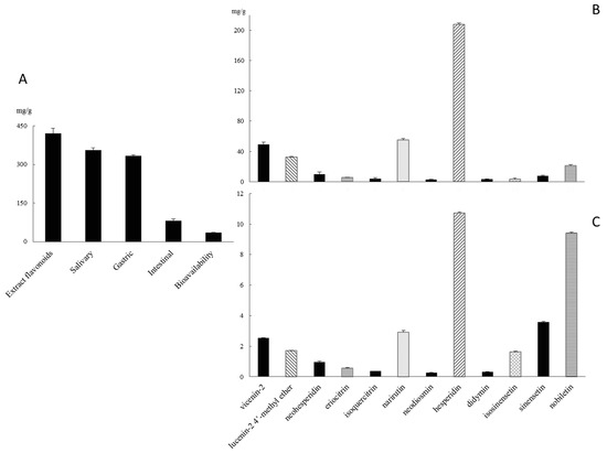 Our experimental results confirmed that flavonoid degradation might occur primarily in the intestine (Figure 1A) [24]. On average, a loss of 48.2% and 85.8% of the native flavonoid pattern after intestinal digestion was obtained (Table S1). It has been previously demonstrated that the alkaline conditions of the small intestine, when combined with pancreatin and bile digestion, transform some of the flavanones (hesperidin and narirutin) into insoluble chalcones [23].
