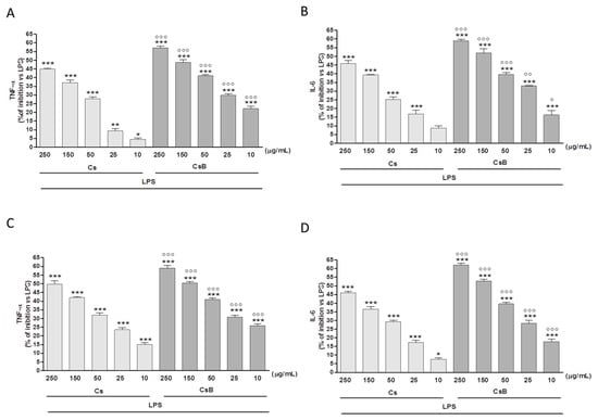 Effect of Cs and CsB (250–10 μg/mL) on LPS –induced TNF-α (Panel A and Panel C) and IL-6 (Panel B and Panel D) production in J774A.1 macrophages. TNF-α and IL-6 production was measured in the supernatants of J774A.1 cells treated with Cs and CsB (250–10 μg/mL) and LPS (1 µg/mL) for 18 h by means of ELISA. Values, mean ± s.e.m., are expressed as % of inhibition vs. J774A.1 treated with LPS alone. ***, ** and * denote p < 0.001, p < 0.01 p < 0.05 vs. LPS alone. °°°, °° and ° denote p < 0.001, p < 0.01 and p < 0.05 vs. Cs.