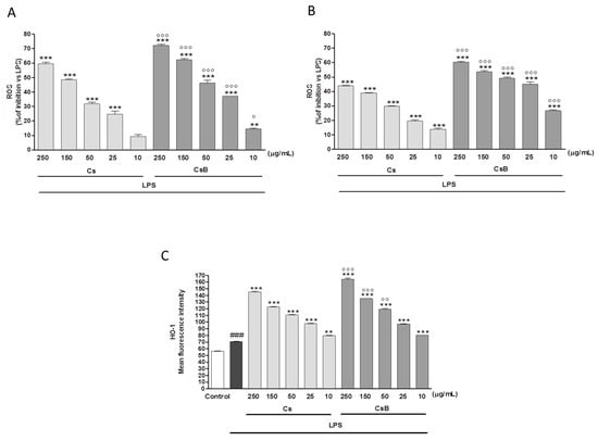 Effect of Cs and CsB (250–10 μg/mL) on LPS-induced ROS in LPS-stimulated J774A.1 macrophages (Panel A and Panel B); Effect of Cs and CsB (250–10 μg/mL) on LPS-induced HO-1 (Panel C) in macrophages J774A.1. Values, mean ± s.e.m., are expressed as % of inhibition vs. J774A.1 treated with LPS alone and as mean fluorescence intensity. ### denotes p < 0.001 vs. control. *** and ** denote p < 0.001 and p < 0.01 vs. LPS alone. °°°, °° and ° denote p < 0.001, p < 0.01 and p < 0.05 vs. Cs.