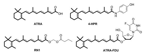 Retinoic acid (RA), an endogenous metabolite of vitamin A (retinol), is an essential regulator of cell growth and differentiation [5]. RA exists in four isomeric forms, all-trans retinoic acid (ATRA, Figure 1), 9-cis-retinoic acid, 9,13-dicis-retinoic acid and 13-cis-retinoic acid [6]. Among them, ATRA is thought to be the main active isomer displaying its activity by nuclear retinoic acid receptors (RARs), which have three types: α, β and γ, and subsequently regulating gene transcription. ATRA regulates many biological processes, such as cell differentiation, reproduction, and regulation of the immune system [7,8,9]. Additionally, RA is connected with the development of several diseases, including neoplasms [5]. So far, the treatment of acute promyelocytic leukemia by ATRA has been conducted [10]. However, intolerable side effects and high clearance hinder the clinical application of ATRA. To overcome the shortcomings, many chemical modifications of ATRA have been prepared, and several important agents, including 4-HPR, RN1 and ATRA-FDU (Figure 1), were reported to have the potential to kill various cancers, such as leukemia, breast cancer, lung cancer, pancreatic cancer, colon cancer and melanoma carcinoma [11,12,13,14,15]. Wu and co-workers showed that both RARα and RARβ were mediators in the antineoplastic function of ATRA in gastric MKN-45 cells [16]. Meanwhile, ATRA could induce gastric BGC-823 cell death by apoptosis, cell cycle arrest and regulation of RARα [17,18,19].