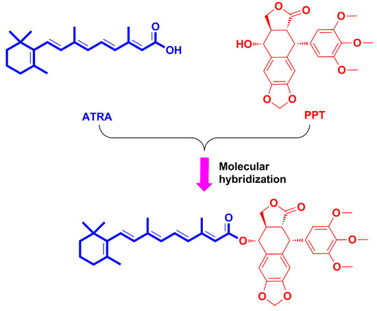 To create more effective antitumor candidates that more affordable, hybridization of natural products or natural product-drug is one promising approach for designing lead compounds [27,28]. Recently, our group has described the synthesis and antiproliferative potential of the PPT conjugates [29,30,31,32,33,34,35], and some derivatives showed dramatic activity. For example, the artesunate-podophyllotoxin conjugate exhibited notable cytotoxicity against several cancer cell lines. Previous reports demonstrated that both ATRA and PPT derivatives displayed antiproliferative activity towards gastric cancer cells. Moreover, the expression of RARs in various gastric cancer cell lines was different, which was connected with the antiproliferative effect of ATRA, however, whether the anticancer activity of PPT against gastric cancer cells was connected with the RARs remains unclear. In addition, it is also unknown whether the conjugate of ATRA and PPT exhibits more anti-gastric cancer potential and less toxicity. The present article described the design, synthesis and in vitro antiproliferative activity of a novel conjugate of ATRA and PPT (Figure 3) using molecular hybridization strategy [36] against two human gastric cancer cell lines (MKN-45 and BGC-823) and a normal human liver cell line (L-O2). The conjugate was preliminarily investigated for its underlying molecular mechanisms.