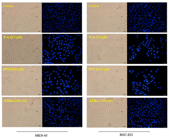 Effects of P-A, PPT and ATRA on the morphology of MKN-45 and BGC-823 cells. Cells were incubated with 1% DMSO, P-A (0.5 μM), PPT (0.05 μM) or ATRA (100 μM) for 24 h. Subsequently, cells were stained with Hoechst 33342 for microscopy. Magnification, ×200; scale, 20 μm.