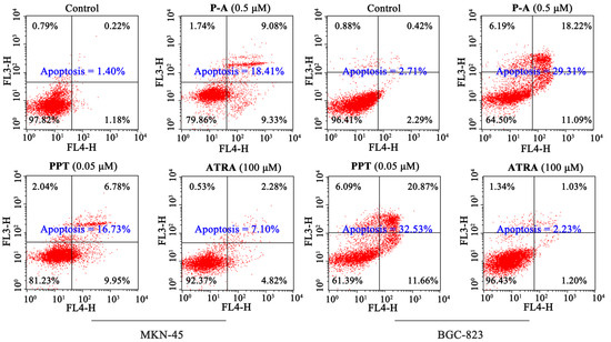 Effects of P-A, PPT and ATRA on the apoptosis of MKN-45 and BGC-823 cells. Cells were incubated with 1% DMSO, P-A (0.5 μM), PPT (0.05 μM) or ATRA (100 μM) for 48 h.