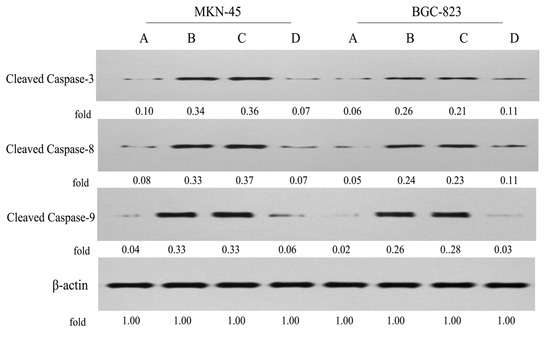 To further validate the underlying mechanisms of apoptosis induced by conjugate P-A, the expression levels of cleaved caspase-3, -8 and -9 in MKN-45 and BGC-823 cells were examined by Western blot (Figure 8). We observed that P-A (0.5 μM) and PPT (0.05 μM) significantly enhanced the levels of cleaved caspase-3, -8 and -9 in both MKN-45 and BGC-823 cells, compared to the control group. However, ATRA (100 μM) displayed no significant effect on MKN-45 cells, but it slightly increased the levels of cleaved caspase-3 and -8 in BGC-823 cells. These results revealed that conjugate P-A induced apoptosis in MKN-45 and BGC-823 cells through stimulation of intrinsic and external mitochondrial pathways.