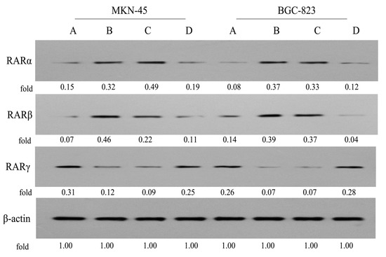 It was reported that RARs were mediators in the anticancer function of ATRA in gastric MKN-45 and BGC-823 cells [16,17,18,19]. However, to the authors’ knowledge, little is known about the RARs regarding the involvement of PPT in gastric carcinoma. In order to gain more insight into the mechanisms of conjugate P-A in suppressing gastric cancer cell proliferation, we then examined the levels of RARs in MKN-45 and BGC-823 cells using Western blot assay. As seen in Figure 9, initially we found that the expression level of RARα was higher, but the level of RARβ was lower in MKN-45 cells, compared to in BGC-823 cells. Also, the RARγ level in both two cancer cell lines was almost equipotent. When MKN-45 and BGC-823 cells were treated with P-A (0.5 μM), the expression levels of RARα and RARβ were increased, while the level of RARγ was decreased, which may be associated with the PPT skeleton, because 0.05 μM PPT could stimulate the expression of RARα and RARβ, but inhibit the expression of RARγ. Moreover, ATRA (100 μM) only slightly increased RARα and RARβ levels, but decreased RARγ level in MKN-45 cells. In addition, ATRA (100 μM) slightly increased the level of RARα, downregulated RARβ expression, and had no notable effect on the level of RARγ in BGC-823 cells. These data indicated that PPT could regulate the expression levels of RARs in gastric cancer cells for the first time, as well as the conjugate P-A. Similar to its precursor PPT, it also modulated RARs levels in both MKN-45 and BGC-823 cells, which were different from another precursor, ATRA.