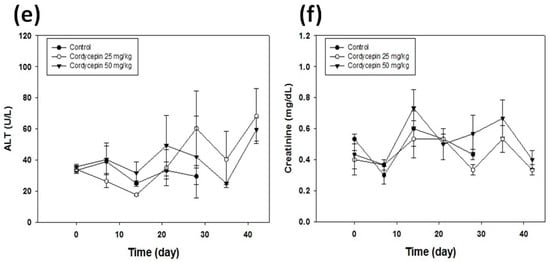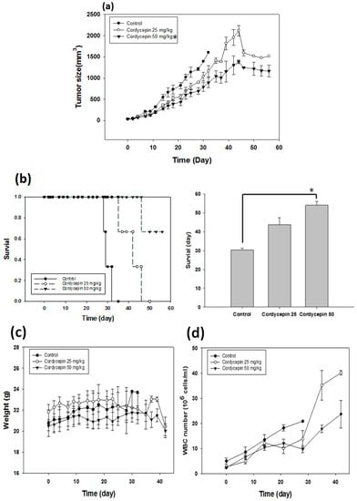 We treated the tumor-bearing mice with phosphate buffered saline (PBS) and 25 mg/kg or 50 mg/kg cordycepin five days a week for eight weeks. We observed that the tumor growth significantly reduced in the 50 mg/kg cordycepin group compared with 25 mg/kg cordycepin or PBS group (Figure 2a). The survival time was 30.3 ± 0.9 days, 43.7 ± 3.8 days and 54 ± 2.0 days for the PBS, 25 mg/kg and 50 mg/kg cordycepin groups, respectively (Figure 2b). Despite prolonged administration of cordycepin, the weights of mice did not change (Figure 2c). White blood cell counts, liver alanine aminotransferase (ALT) and renal function (serum creatinine) were also not affected under the treatment conditions (Figure 2d–f).