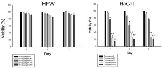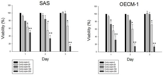 Cordycepin inhibited cell growth against two OSCC cancer cells: SAS and OEC-M1. The cancer cell viability decreased in a dose- and time-dependent manner after cordycepin treatment (Figure 3). The concentration at which 50% cell growth inhibition was achieved (IC50 with 24 h cordycepin treatment) was 122.4 μM and 125.2 μM for SAS and OEC-M1 cells, respectively. Against the normal counterpart, HFW fibroblast cells, cordycepin showed no cytotoxic effects even at a high concentration of 200 μM. However, cordycepin resulted in cell viability inhibition on another human normal counterpart, keratinocytes HaCaT cells (Figure 3).