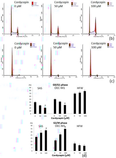 Cordycepin resulted in OSCC cell cycle arrest at G2/M phase. The cells were treated with the indicated concentrations (0, 50 and 100 μM) of cordycepin for 24 h. a–c shows representative flow cytometry of SAS (a), OEC-M1 (b), and fibroblast HFW (c) cells; (d) demonstrated the analysis of cell cycle data with the experiments triplicated (* p < 0.05).