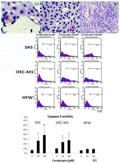 Cordycepin triggered apoptosis in two OSCC cell lines, but not human fibroblasts. The results for Liu’s staining of SAS, OEC-M1 and HFW cells treated with 100 μM cordycepin for 48 h are shown in (a–c), respectively. The cordycepin-treated OSCC cells showed morphological characteristics of apoptosis, including cell shrinkage (yellow arrow) and apoptotic body formation (red arrow), while the HFW cells were not affected. The caspase-3 activity assay was performed for the three types of cells after 48 h of treatment with placebo, 50 μM and 100 μM cordycepin (d). Significantly increased caspase-3 activity was observed on increasing the cordycepin concentration in both the OSCC cells. However, caspase-3 activity did not increase in HFW cells after cordycepin treatment (e) (* p < 0.05, ** p < 0.01).