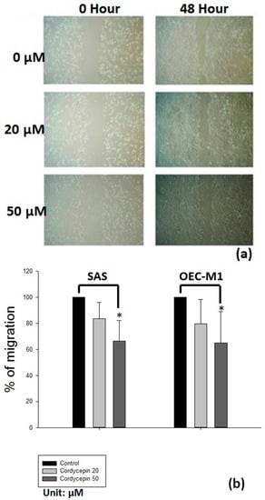 Cordycepin inhibited the migration ability of oral cancer cells. (a) Presents wound closure by SAS cells after 48 h of 0 μM, 20 μM and 50 μM cordycepin treatment. Codycepin at 50 μM significantly inhibited wound closure in both OSCC cells compared with the control or 20 μM cordycepin; (b) presents the mean values for delayed wound closure (three experiments) in SAS and OEC-M1 cells (* p < 0.05).