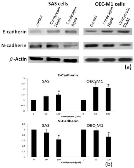 The migration ability was prohibited in both HNSCC cancer cells after 48 h of treatment with cordycepin compared with the placebo group (Figure 6a,b). Furthermore, the migration area of SAS cells was reduced by 20 μM and 50 μM cordycepin to 82.6% and 63.5% (p < 0.05), respectively, compared with the placebo group. The migration area of OEC-M1 cells was also decreased by 20 μM and 50 μM cordycepin to 78.4% and 61.5% (p < 0.05), respectively. We then tested whether cordycepin could reverse EMT to inhibit the migration ability of OSCC cells. After treatment with 50 μM cordycepin, the expression of epithelial marker E-cadherin increased significantly (p < 0.05) compared with placebo treatment. Meanwhile, the expression of mesenchymal marker N-cadherin also decreased after treatment with 50 μM cordycepin (p < 0.05) (Figure 7a,b).