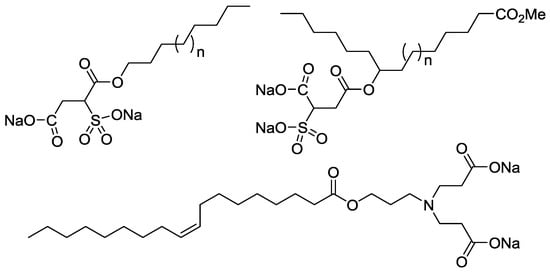 - Kumar, P.P.; Ramesh, P.; Kanjilal, S. Sulfosuccination of methyl ricinoleate and methyl 12-hydroxy stearate derived from renewable castor oil and evaluation of their surface properties. J. Surfact. Deterg. 2016, 19, 447–454. [Google Scholar] [CrossRef]