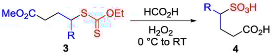To a stirred and mixed solution of 98% formic acid (15 mL) and 30% H2O2 (10 mL), xanthate 3 (3 mmol) was added dropwise. The reaction mixture was stirred at room temperature for 2 h and then at 65 °C overnight. The removal of solvents in a vacuum afforded 4-sulfoalkanoic acid 4.
