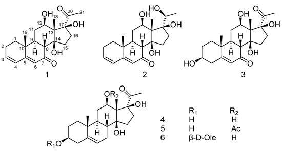 - Warashina, T.; Noro, T. Steroidal glycosides from the roots of Metaplexis japonica M. Part II. Chem. Pharm. Bull. 1998, 46, 1752–1757. [Google Scholar] [CrossRef]