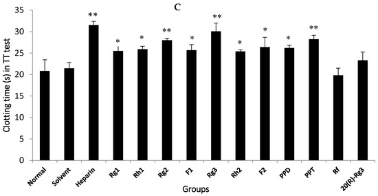 In vitro anti-coagulation activities of 11 ginsenosides. (A) APTT test; (B) PT test; (C) TT test. * p < 0.05, ** p < 0.01 versus the normal control. APTT: activated partial thromboplastin time; PT: prothrombin time; TT: thrombin time.