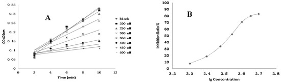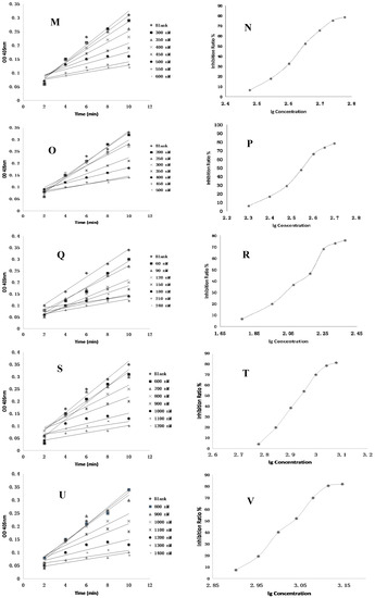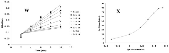 The inhibition profile figures against coagulation factor X. (A,B) Rg1; (C,D) Rh1; (E,F) Rg2; (G,H) F1; (I,J) Rg3; (K,L) Rh2; (M,N) F2; (O,P) PPD; (Q,R) PPT; (S,T) 20(R)-Rg3; (U,V) Rf; (W,X) Rivaroxaban. lg: log10, OD: optical density.