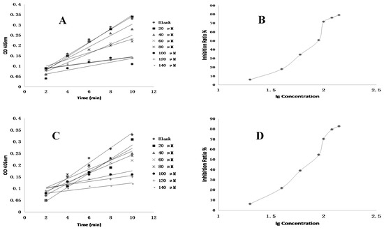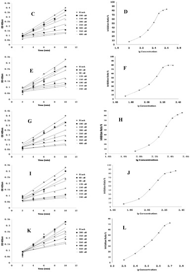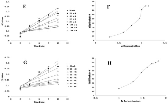 The inhibition profile figures of ginsenoside (Rg2) (A,B); ginsenoside (Rg3) (C,D); protopanaxtriol (PPT) (E,F) and Ximelagatran (G,H) against thrombin.