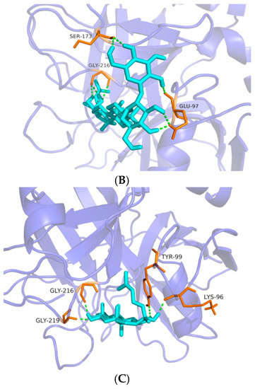 Interaction modes of ginsenosides 5, 13 and 18 within FXa binding pocket (A–C). (A) H-bonds between Rg2 (5) and FXa pocket; (B) H-bonds between Rg3 (13) and FXa pocket; (C) H-bonds between PPT (18) and FXa pocket; light blue, ligands (Rg2, Rg3 and PPT); pink, ligands; orange, residues of the binding protein (FXa); green dashed line, H-bond.