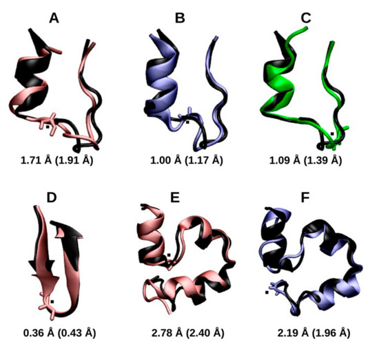 The central structure of the largest cluster in Trp cage Cα-centered Gly radical in place of Gly10 (GLR10) (in red, A), Trp cage(GLR11) (in blue, B), Trp cage (GLR15) (in green, C), Trp zipper(GLR6) (in red, D), villin(GLR11) (in red, E), and villin(GLR33) (in blue, F). Proteins are aligned with those of their respective closed-shell proteins (in black). The root-mean-squared deviation (RMSD) values of the alignment is shown, whereas the RMSD of each representative structure from the respective starting structure is shown in parentheses. Those of the closed-shell Trp cage, villin, and Trp zipper are 0.86 Å, 0.50 Å, and 2.60 Å, respectively. The residue containing the radical center is shown in the licorice representation, with the radical center represented by a black dot.