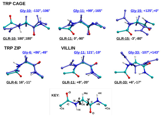 Figure 3 also compares the central structure of the largest cluster of the simulations; however, in this plot, each GLR residue is aligned to its respective Gly residue. The adjacent amide bonds and the respective Cα atoms of the neighboring residues towards the N-terminus (−Cα) and the C-terminus (+Cα) are included in order to provide a closer view of the local (within residue) effect of radicalization. The φ and Ψ angles of each Gly and GLR residue are also shown. The majority of the φ and Ψ angles became planar. GLR10 of the Trp cage became fully extended to φ, Ψ = 180°, 180°. This conformation is also known as anti, anti, with a reference to the Newman projection of dihedral angles, or βL, which is most similar to the conformation of the β-pleated sheet. The GLR residues of the Trp zipper and Villin headpiece each form the C7, or ring conformation, with the φ and Ψ angles close to 0°. This ring is comprised of -O, -C, N, Cα, C, N+, H+, where the negative sign indicates atoms belonging to the neighboring residue towards the N-terminus and the positive sign indicates atoms belonging to the neighboring residue towards the C-terminus (Figure 3). The conformation of GLR10 of the Trp cage, GLR6 of the Trp zipper and GLR11 and GLR33 of the villin headpiece can all be described as planar, as the atoms in the C7 ring lie (almost) in a plane. This planar conformation is made possible by the loss of an Hα atom from Gly when GLR forms, allowing the remaining Hα to lie in the plane formed by the C7 atoms.