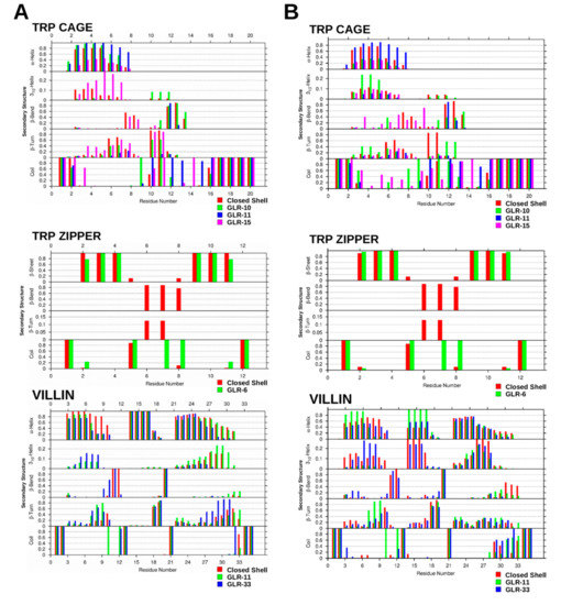 The results of the cluster analysis of all of the simulated proteins are listed in Table 1. The structures within each cluster were within an RMSD of 1.0 Å of each other. The largest cluster of the closed-shell Trp cage contained 56.6% of the structures in its corresponding trajectory, whereas the largest cluster of the closed-shell Trp zipper and villin contained 97.8% and 63.3% of the structures, respectively. The presence of GLR10 and GLR15 in the Trp cage reduced the cluster size by half, and GLR11 in the villin headpiece led to a reduction by more than two-thirds. The reduction shown by GLR15 in the Trp cage was less pronounced, whereas little change was observed in the size of the largest cluster when GLR6 was introduced in the Trp zipper and GLR33 was introduced in the villin headpiece. The representative Trp cage, Trp zipper and villin headpiece structures obtained from the cluster analysis deviate from their respective NMR structure by 0.86 Å, 0.50 Å, and 2.60 Å, respectively.