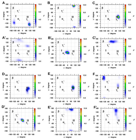 The φ and Ψ density plots for (A): Gly10, (B): Gly11, (C): Gly15 and containing Gly radicals (GLR) at their respective Gly positions (A′, B′, and C′) of Trp cage; (D): Gly6 and (D′): GLR6 of Trp zipper; along with (E): Gly11, (F): Gly33 and the respective radicals, (E′) and (F′) of the villin headpiece. As a reference, the areas of the surface that correspond to the α-helix (αL) and β-sheet (β), position two of the classic (γL) and inverted (γL′) γ-turns and position three of type-one (I) and type-two (II) β-turns are are also labeled.