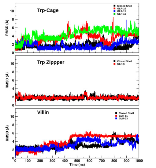 The ΔG° of unfolding of Trp cage is +3.2 kJ·mol−1, whereas the melting temperature is 317.1 K [48]. The Trp zipper has an unfolding free energy between +2.5 and +7.1 kJ·mol−1, and a melting temperature of 323.1 K [42]. The villin headpiece is considered to be ′moderately′ stable in terms of its unfolding free energy (ΔG° = +13.0 kJ·mol−1), although it has an experimentally determined melting temperature of 342.1 K and a melting temperature of 325.1 K, as determined in simulations [49,50]. Despite the relatively high melting point with respect to the other two proteins of this study, villin is capable of unfolding and refolding spontaneously [51]. This can account for the large RMSD (4.25 Å) shown by the closed-shell villin in this study. The dissociation of the Asp9-Arg16 salt bridge can account for the relatively large RMSD of the closed-shell Trp cage (3.89 Å); however, the hydrophobic core remained intact and this salt bridge has also been shown to dissociate in simulations with various force fields [52]. The radicalization of the Gly residues affects the RMSD of each protein in the order of villin > Trp cage > Trp zipper, despite the fact that villin has largest ΔG° of unfolding and the highest melting temperature. Only in the case of villin did radicalization cause the RMSD of the respective radical to differ from the closed-shell protein by greater than 2.0 Å after 100 ns; however, the RMSD of radicalized forms of Trp cage and villin increased to almost 7 Å after 1 µs.