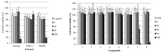 Cytotoxic effects of the three extracts and eight compounds isolated from E. sieboldianus in 3T3L1 cells. Data are expressed as the mean ± SD from three independent experiments. The same letters indicate that there are no differences between those groups, and different letters indicate significant differences (p < 0.05).
