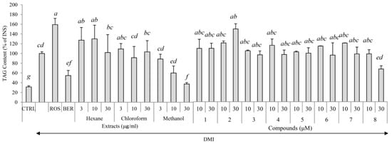 The effects of the three extracts and eight compounds isolated from E. sieboldianus on triglycerol levels in 3T3-L1 cells. The 3T3-L1 cells were cultured in 24-well plates and differentiated under the conditions described in the materials and methods section for each compound. Undifferentiated cells, cells with the addition of the MDI mixture (a mixture of 0.5 mM 3-isobutyl-1-methyl xanthine (M), 0.1 μM dexamethasone (D), and 2 μM insulin (I)), rosiglitazone, and berberine, are indicated by CTRL, INS, ROS, and BER, respectively. On day 8 of culturing, the medium was removed and cells were lysed using Ripa buffer. Triglycerol levels were determined by the Triglycerol E-test Wako (Wako Pure Chemical, Osaka, Japan). Data are presented as the mean ± SD from three independent experiments. The same letters indicate that there are no differences between those groups, and different letters indicate significant differences (p < 0.05).