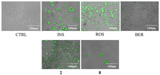 Adiponectin is a hormone controlling energy expenditure, glucose homeostasis, and insulin resistance [9]. Insulin resistance is improved by increasing adiponectin [10]. In addition, it has been reported that insulin resistance in diabetic mice was improved by oral administration of adiponectin [12]. The effects of 2 and 8 on the levels of adiponectin are shown in Figure 5. ROS, Compound 2, and 8 up-regulated the expression levels of adiponectin dose dependently. In contrast, the addition of BER down-regulated the expression levels of adiponectin.
