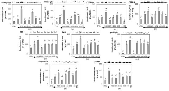 Perilipin coats lipid droplets in adipocytes and induces lipolysis [40,41]. The effects of 2 and 8 on the levels of perilipin are shown in Figure 5. Similar to the effects on the levels of lipogenic proteins, ROS up-regulates and BER down-regulates the expression of perilipin. Adding 2 or 8 did not change perilipin levels.