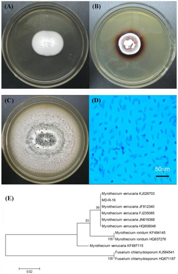 - Wu, W.P. Studies on hyphomycetes in Hebei ΙΙΙ. species of the genus Myrothecium Tode: Fr. on plants. J. Hebei Acad. Sci. 1991, 8, 69–74. [Google Scholar]