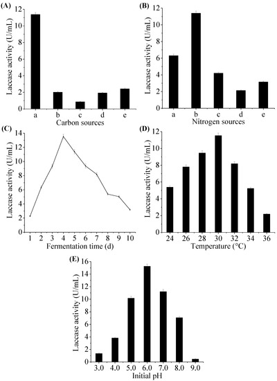 Effects of nutrient and fermentation factors on laccase production by M. verrucaria MD-R-16. (A) Effect of carbon sources on laccase production. The carbon source (from a–e) is successively glucose, sucrose, starch, lactose, and maltose. (B) Effect of nitrogen sources on laccase production. The nitrogen source (from a–e) is successively yeast extract, peptone, beef extract, ammonium chloride, and ammonium nitrate. (C) Effect of fermentation time on laccase production. (D) Effect of temperature on laccase production. (E) Effect of initial pH values on laccase production. All experiments are done by changing one independent variable while fixing others at certain levels.
