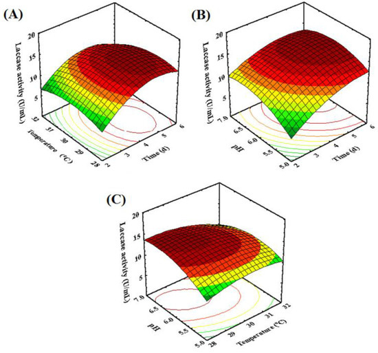 Response surfaces plots for the laccase production by M. verrucaria MD-R-16: (A) varying the fermentation temperature and time; (B) varying the fermentation time and pH of the initial fermentation medium; (C) varying the fermentation temperature and pH of the initial fermentation medium.