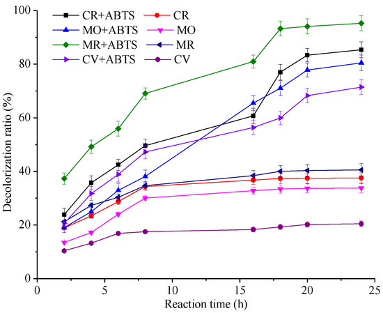Dye decolorization efficiency depends upon their chemical structures, enzymes, and system conditions. Figure 4 shows the effects of time course of decolorization on the selected dyes by the laccase, in the presence or the absence of ABTS. In the absence of ABTS, the laccase showed decolorization capability toward the selected dyes, with less than 50% of dyes decolorizing after 24 h of incubation, indicating that the laccase can decolorize the synthetic dyes. The reason is that fungi could produce some low-molecular weight compounds that can potentially act as a redox mediator [44]. In the presence of ABTS, our observations have suggested that the dye decolorization was continuously increased during the first 18 h and no obvious change was observed up to 24 h. The drop in the rate of dye decolorization after an initial fast reaction could be due to inactivation of the enzyme. Besides, the substrate of ABTS can be oxidized by laccase. Then ABTS becomes an active cation radical. However, in the presence of dyes, ABTS+ may take electrons from dyes and recover to their original state [15,45]. Thus, ABTS can be recycled in the process of decolorization [45]. With the dye decolorization, less and less electron-rich compounds can be used by ABTS+, which may lead to a slight change in the rate of decolorization.