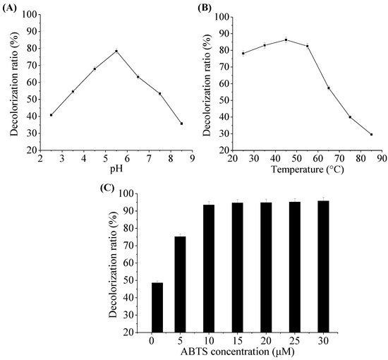 Effects of different parameters on MR decolorization in an ABTS-laccase mediated system: (A) pH; (B) Temperature; (C) ABTS concentration. Data were expressed as mean ± SD (n = 3).
